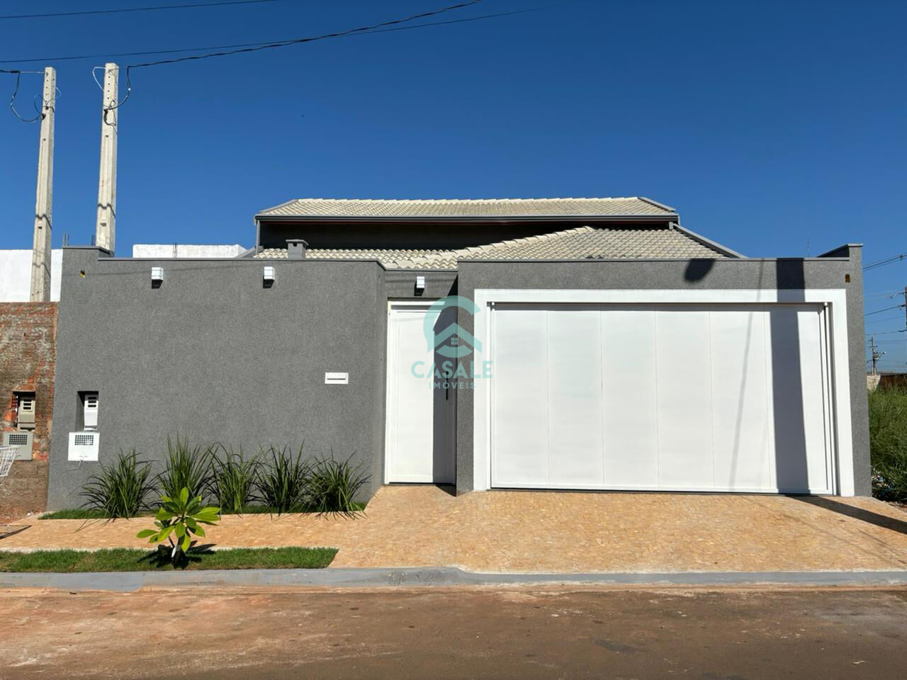 Fachada com paisagismo e arandelas.