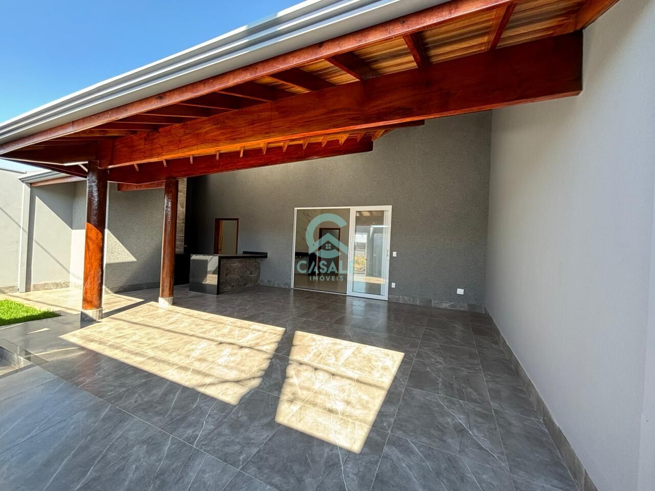 Área gourmet forrada com lambril, com balcão para cooktop, churrasqueira e bancada de apoio.