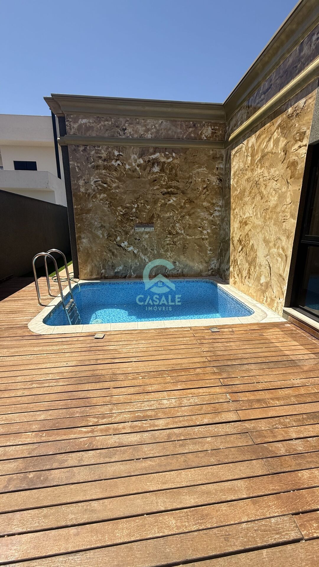 Área de lazer com deck, piscina, cascata e churrasqueira com balcão.